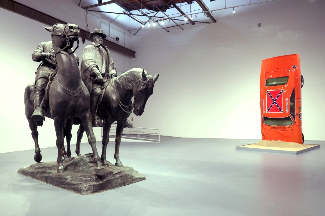 Throughout the galleries, Cauleen Smith’s video installation threads the exhibition with a quiet, persistent call-and-response, its live feeds and breadcrumb structure tracing how monumentality functions as propaganda, ritual, and repetition across time; as unexpected registers continue to surface. Hugh Mangum’s early twentieth-century photographs, originally commercial portraits, reveal an ethics of proximity that feels radical in retrospect—Black and white sitters sharing the frame with an unforced equality, accidental double exposures producing ghostly overlays that read as hauntingly prescient. Elsewhere, a graffitied statue of Robert E. Lee and Stonewall Jackson’s backside humiliation punctures any lingering aura of power with physical comedy and blunt truth; while in the same room, Hank Willis Thomas’s Confederate-flagged car, nose-down in the earth, introduces a sharp note of visual wit, its own art-historical echoes inseparable from pop culture context. Davóne Tines and Julie Dash’s Homegoing offers a necessary tonal respite; its musically radiant, formally generous, and quietly exultant video installation introduces joy without erasing grief, allowing sound and duration to hold mourning in a register of convocation and love. Walter Price’s abstract paintings, composed through footstep marks and liquid surfaces, evoke water, passage, and ceaseless movement, their beauty inseparable from histories of displacement, reminding us that monuments do not speak on their own