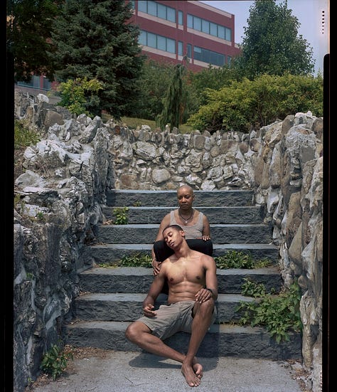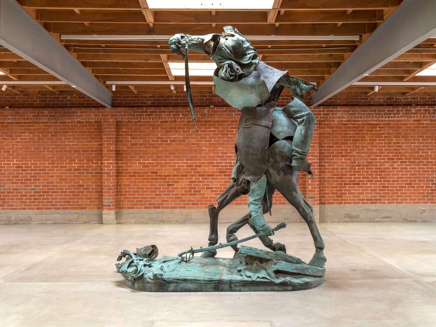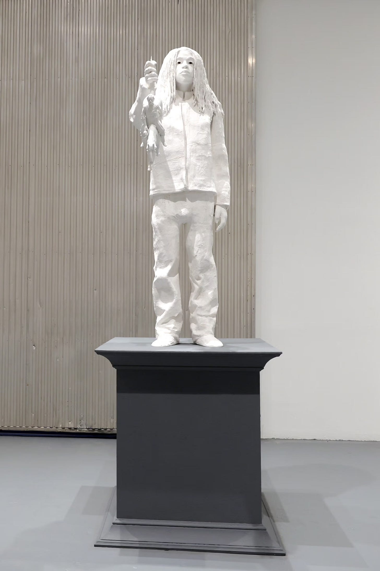 The bulk of MONUMENTS unfolds across MOCA’s Geffen Contemporary as a dense, emotionally volatile field rather than a didactic survey, its lasting power accumulating through juxtaposition, resonance, and tonal variation. While decommissioned and defaced Confederate statues provide an undeniable narrative touchstone—bronze bodies stripped of authority, smeared with the residue of public rage—the exhibition’s deeper intelligence emerges through the contemporary works that absorb, reroute, and reimagine the visual grammar of memorialization itself. Leonardo Drew’s immense white cube, constructed from processed cotton, adopts the solemn mass and reverent posture of civic memorials, while quietly relocating monumentality into material history, labor, and racial injustice. Jon Henry’s large-scale photographs stage Black mothers cradling their sons in poses drawn from Renaissance Pietàs, collapsing art history and contemporary violence into images that are neither sensational nor illustrative, but devastating in their restraint—grown men held with the weight of both love and consequence. Karon Davis’s Descendant occupies the statuary vernacular with deliberate clarity, placing a young Black figure into a language long reserved for sanctioned heroism, its stillness and scale allowing the work to operate less as a provocation than as a welcome meditative recalibration.