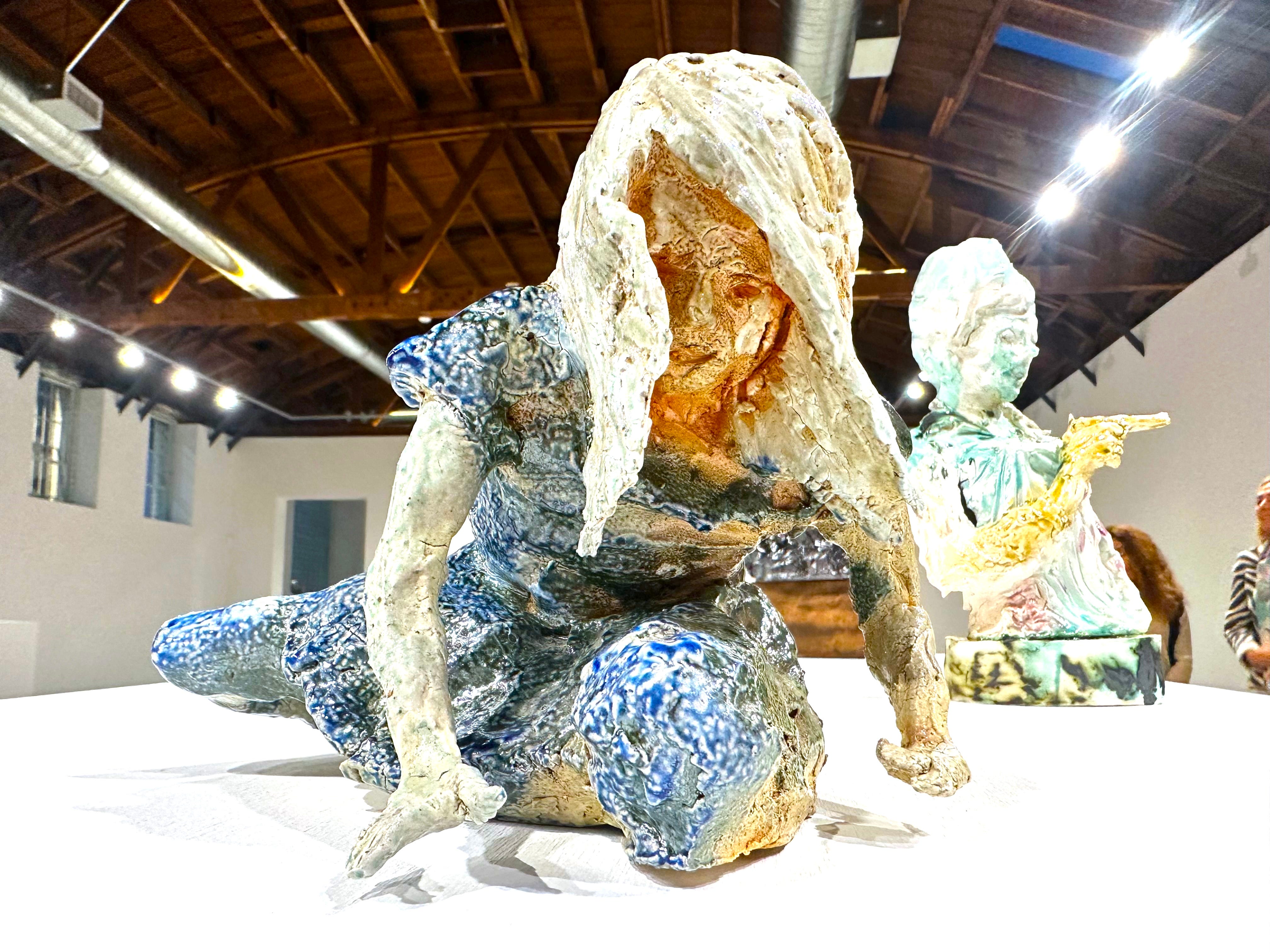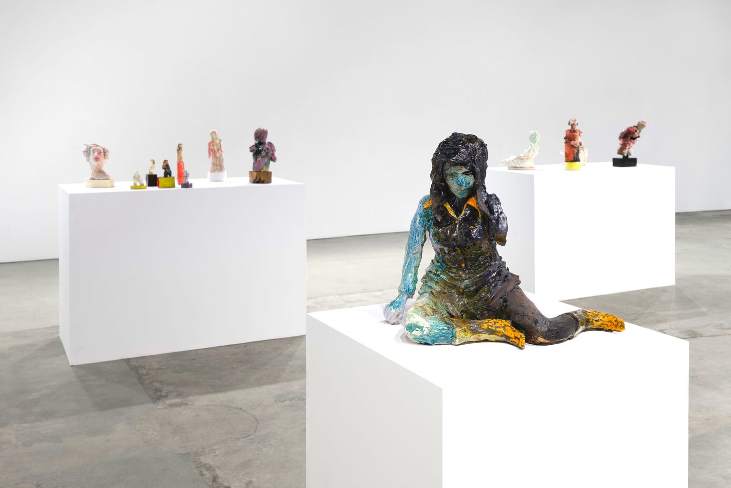 Cynthia Lahti: Trouble, on view at James Fuentes Gallery. These poignant and perfectly imperfect ceramics sit inside a moment where the medium has reasserted itself as a corporeal proxy whether or not the body is depicted—breakable, heat-scarred, colorific, stubbornly resilient, and more interesting with battle scars; and Lahti makes the metaphor literal with gusto. The deliriously unprecious figures slump, kneel, brace, and lean, their anatomies pushed off axis by gravity, glaze, and the will of the kiln; surfaces have thickened and blistered until skin and garment read equally as a surface and a wound. Color does real work, too—acid yellows underfoot, candy-orange boots, milky blues, bruised purples, polka dots that flirt with decoration while actively interrupting legibility—enacting a painterly logic translated into enamel and slip, enhancing and obscuring the forms at the same time. The pathos is assertive and somatic—these are bodies in trouble, the more endearing due to their diminutive scale and the negative space of phantom limbs—but it’s all cut through with a wicked, defiant humor that refuses the collapse, a sharp resistance embedded in gesture, palette, and attitude. Lahti—known to many beyond the gallery world through lending her work to the 2023 film Showing Up starring Michelle Williams as a ceramics sculptor—keeps the emotional temperature high without resorting to melodrama, letting her glazes pool, crack, and shine where flesh would strain, insisting that fragility and toughness are not opposites but concurrent states here inside the crucible. Through February 14 in Melrose Hill; jamesfuentes.com. —SND