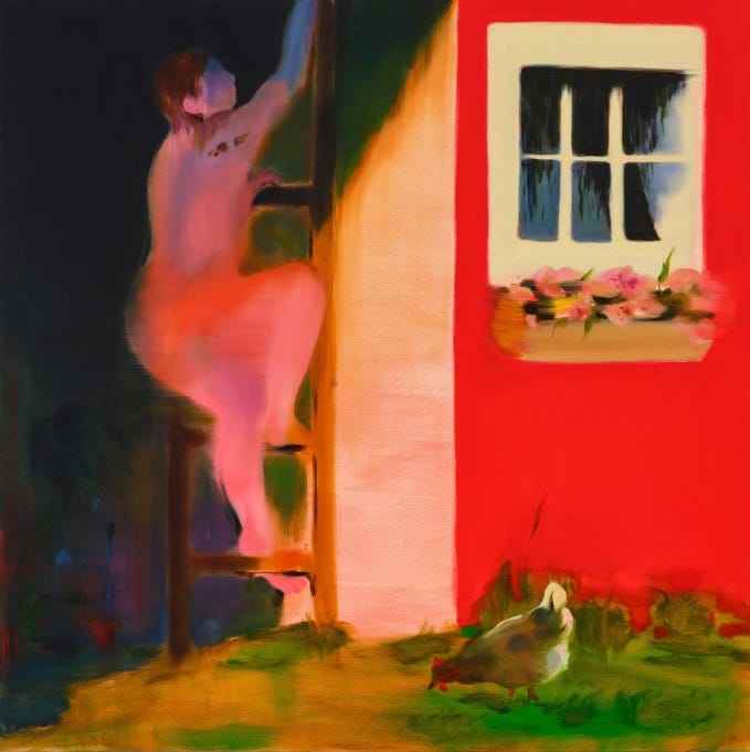 REVIEW: Cathleen Clarke: Morning Star at Night Gallery. This suite of captivating, imaginative paintings by Cathleen Clarke are both exactly and not at all what they seem. They fairly burst off the walls, almost unable to contain the radiant flares of her saturated palette (especially an incandescent barn-red and splendid temperate verdance). At the same time, their initially straightforward presentation of pastoral childhood memories of rural life retreats, like smoke, the more you try to settle into the scenes. Faceless figures and fiery flowers are equally subjected to the bleary streaks of elusive recall, while animals and elements of setting (and one scene-stealing chicken) pop in precision of detail. Clarke’s visual meditations on how memories are influenced by the passage of time, open to subsequent emotional interpretation and even invention, are also a masterful wielding of colorist bravado and painterly dream logic. In larger works we see a proliferation of successive stylistic codes, opportunities to introduce pattern and primary patinas; but in more intimate works the artist is not afraid to lead with ambiguity as she moves between mystery and meaning. On view through February 15 in downtown; nightgallery.ca. —SND