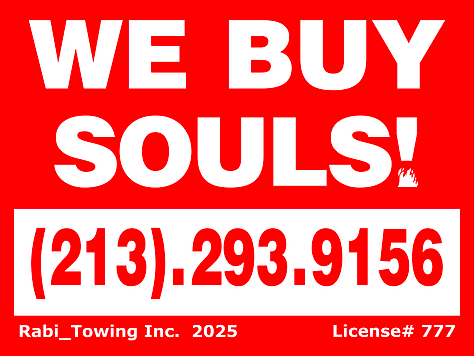 Rabi Towing: We Buy Souls opens Saturday, January 10, 5-7pm at Good Mother Gallery. “WE BUY SOULS.” On the street, the posters look like freaky dares, speaking a language of low-yield advertising—flat red type, a phone number, and an indecent proposal. Wheat-pasted across cities and wired to a working hotline, the project has generated tens of thousands of voicemails—confessions, threats, jokes, negotiations, prayers—each caller asked to assign a price to the immaterial, each message folding belief, desperation, outrage, bravado, fear, and humor into a surreal and unexpectedly poignant oral history snapshot. Inside the gallery, Rabi consolidates four years of public action into a multiplatform installation of painting, sculpture, video, audio, and live participation. Suites of corporate-grade graphics, legally binding contracts, embossed certificates, surveillance-chic display modes, and meticulously fabricated objects amplify both the entertainment and the unease of the situation. Rabi’s background in street art and other public interventions anchors the project’s physical logic of repetitive postering, while his documentarian impulse shapes how the material is gathered, edited, and presented. The result moves at the speed of commerce and with the tenderness of a confessional, inviting absurdist interaction without collapsing into parody. The philosophical, ontological, and literary possibilities of this discourse are as infinite and many-splendored as your lifeforce itself—so what’s it worth to you? On view in West Adams through February 14; goodmothergallery.com. —SND