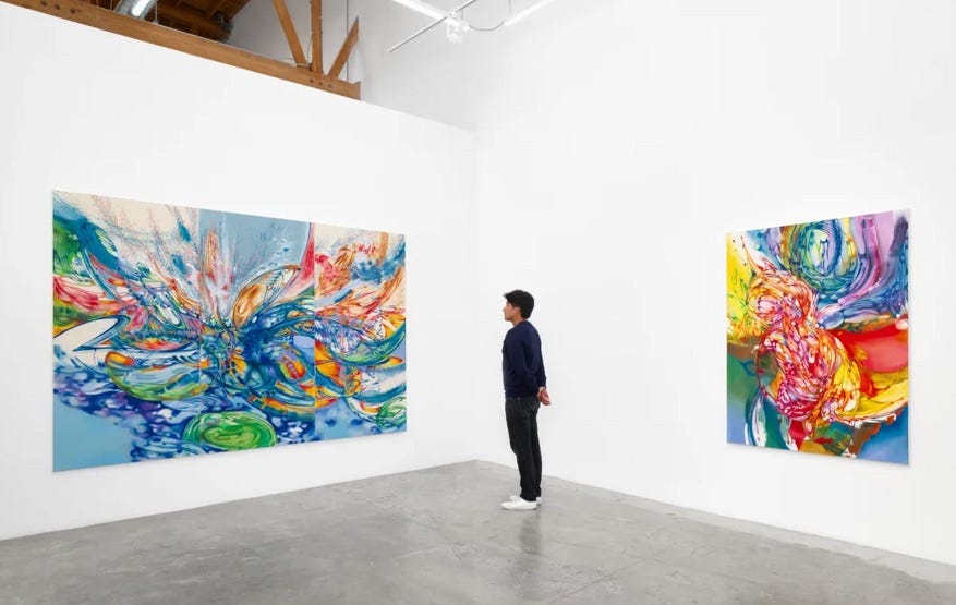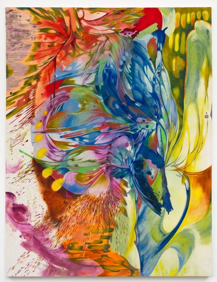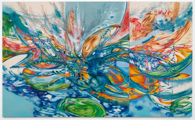 Review: Ji Won Cha: An Eternity From Now is on view at Baert Gallery. Ji Won Cha is a young (b. 1997) abstractionist painter of extraordinary talent, with a prismatic palette, a kaleidoscopic array of mark-making strategies, a relationship to nature she terms the “anxious sublime,” and a way of keeping the eye in perpetual motion that it feels both corporeal and auditory, like the wind, or a symphony. In fact she often immerses herself in the natural world of beaches and forests, gardens and frozen lakes in a kind of energetic preparation that’s more meditation than sketchbook. She is not a landscape painter, but her compositions of bold, wide strokes, drips, splashes, washes, twists and fractals, oozings, and radiances often arrive at a botanical fantasia space that is incredibly appealing. Jewel-toned and optically alive, the paintings are nevertheless too obsessive to be pretty; these undulating works flirt with the far edge of beauty, packed as they are with volatile emotion and a vague sense of danger. On view in downtown through August 3; baertgallery.com. —SND